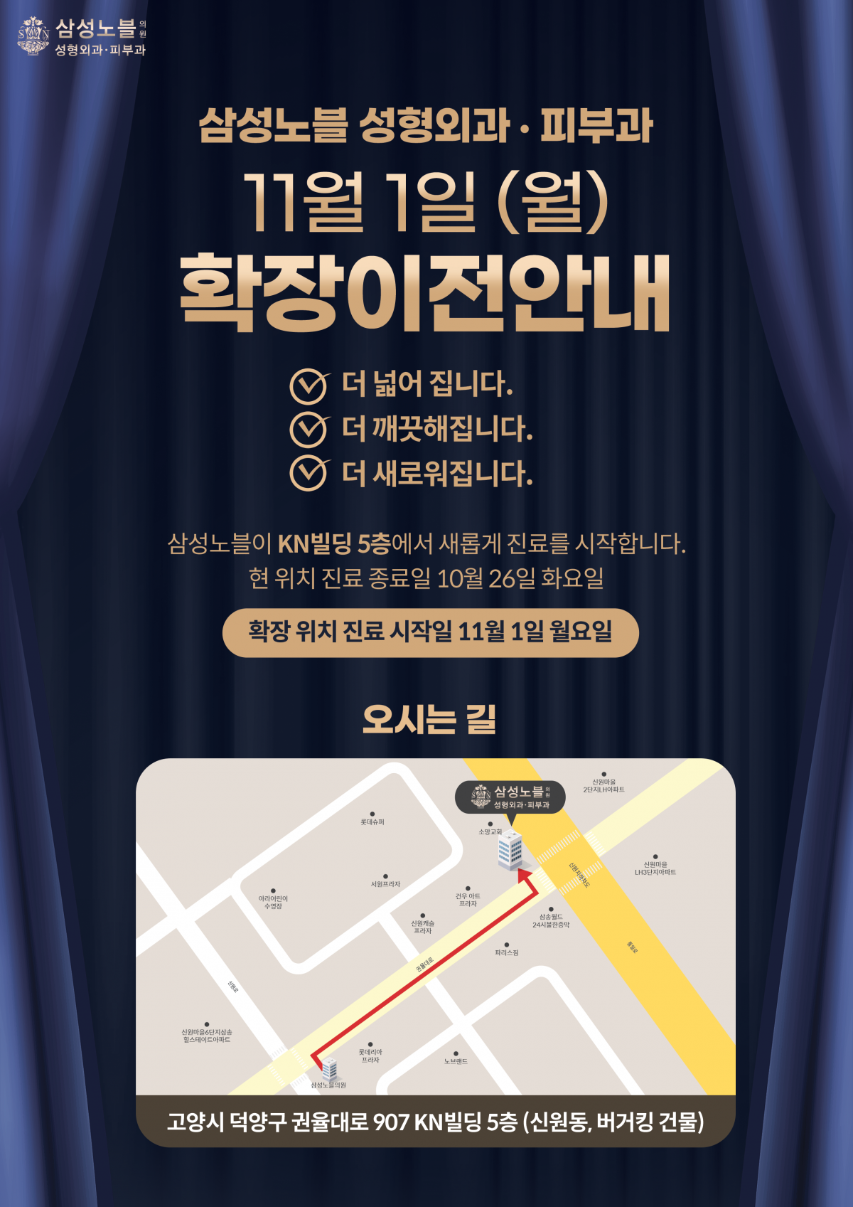확장이전 안내 페이지 정보 작성자 최고관리자 작성일2021-10-30 13:51:04 조회3,658회 댓글0건 관련링크 이전글 다음글 목록 본문 안녕하세요. 삼성노블의원 입니다. 더욱 쾌적한 진료를 위해 확장 이전하여 진료 준비중입니다. 11월 1일에 뵙겠습니다.^^ (기존 건물 대각선 맞은편 버거킹 건물 5층 입니다. 주차장은 건물 뒷편에 있습니다.) 댓글목록 등록된 댓글이 없습니다. 이전글 다음글 목록